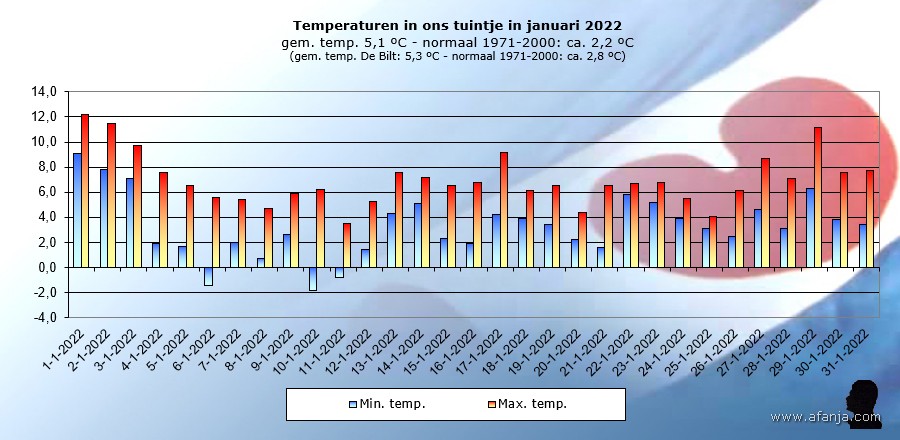 Met uitzondering van 33 mm regen op 2 januari kende de maand in weerkundig opzicht geen uitschieters. In totaal viel er in januari 2022 87 mm regen in onze tuin. Dat is ca. 30 mm meer dan het langjarig gemiddelde, dat verschil zat dus in die ene dag. Met maar 3 echt zonnige dagen was het een saaie en grijze maand. De gemiddelde temperatuur kwam uiteindelijk uit op 5,1°C, ruim 3 graden warmer dan het lokale langjarig gemiddelde in januari over de periode 1971-2000 …