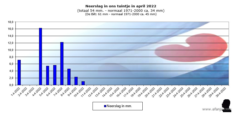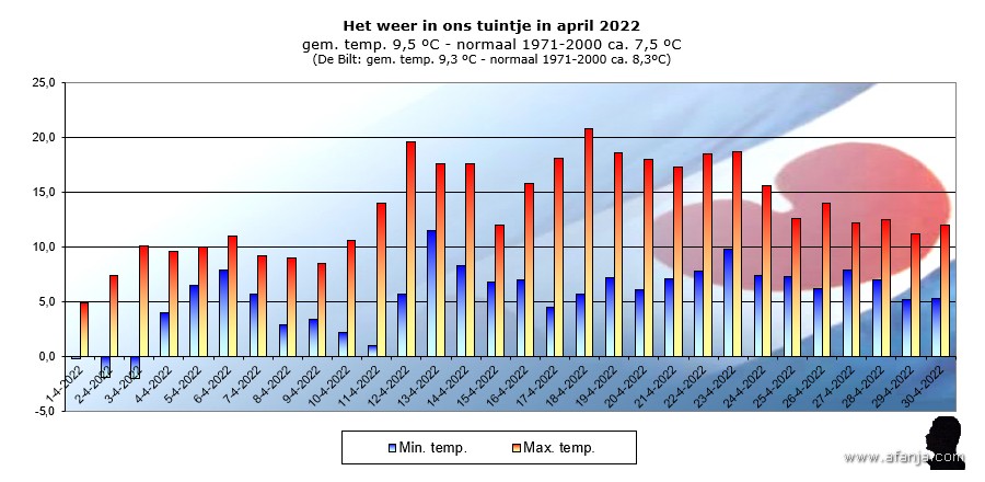 De eerste tien dagen van de maand verliepen duidelijk te koud voor de tijd van het jaar. Bovendien was het erg nat, na de sneeuw volgde een periode met veel regen. Dankzij het natte begin van de maand gaat april 2022 als een natte maand de boeken in. Vanaf de elfde bleef het droog en gingen de temperaturen met een zuidoostelijke stroming omhoog. Op 18 april kon ik de eerste ‘warme’ 20°C van het jaar noteren. De tweede helft van april verliep erg zonnig. In de laatste week daalden de temperaturen bij ons in het noorden onder invloed van een noordelijke stroming tot net boven de 10°C …
