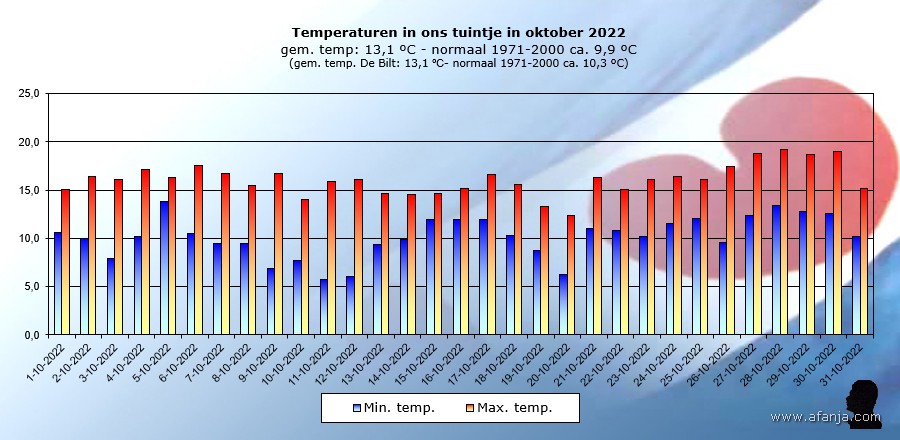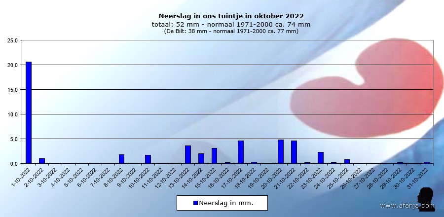Na een warme zomer volgde een zachte herfst, in de laatste week van oktober was het ronduit warm. In ons tuintje werd de hoogste temperatuur op 28 oktober bereikt: 19,2°C, in Eindhoven verscheen die dag 24,6°C op de thermometers. Afijn, onder het motto ‘Een kinderhand is gauw gevuld’ was ik al heel blij met die 19,2°C. De gemiddelde temperatuur kwam in oktober uit op 13,1°C, ca. 3 graden warmer dan het langjarig gemiddelde in oktober voor de periode 1971-2000. Met gemiddeld over het land 38 mm neerslag was het ook een erg droge maand. Dankzij ruim 20 mm regen op 1 oktober hadden wij aan het eind van de maand met in totaal 52 mm weer niks te klagen …