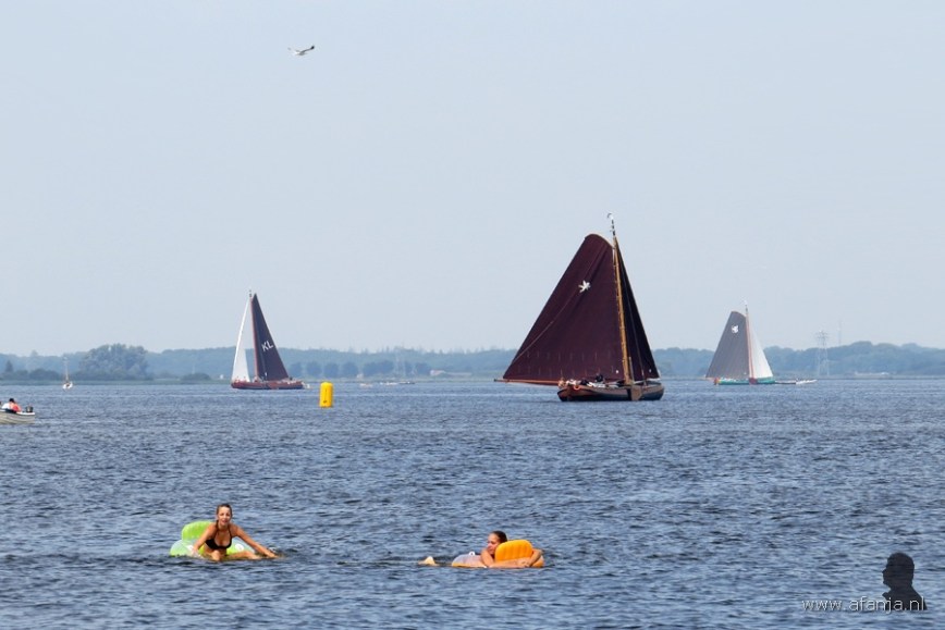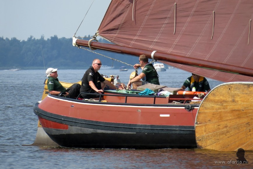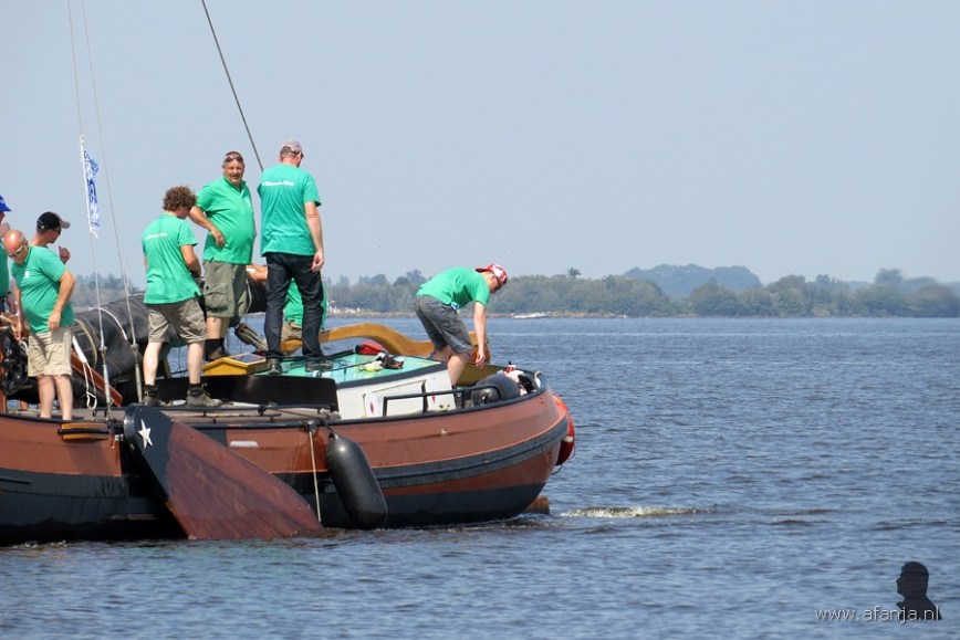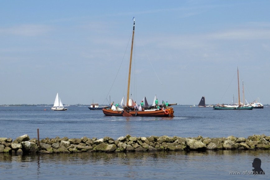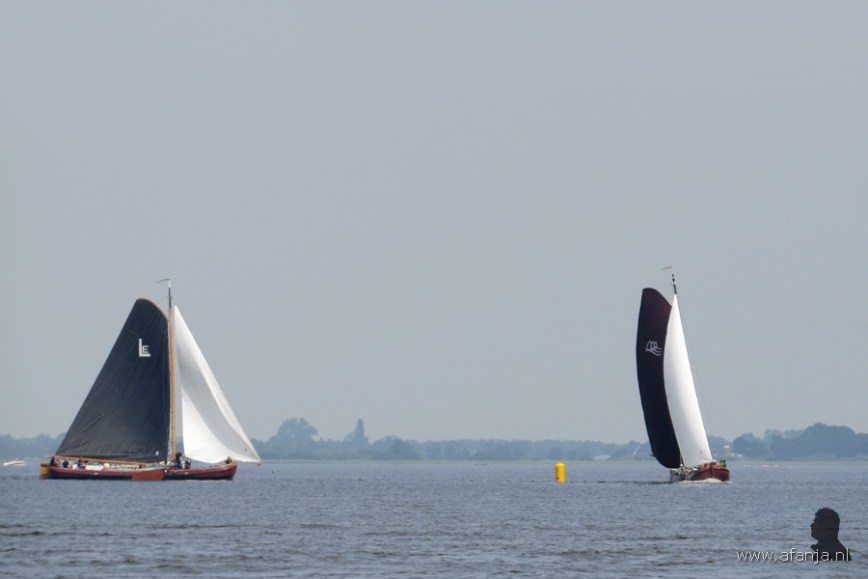 Wat later dan gepland konden de skûtsjes in de Klasse a-klein – dit zijn skûtsjes met een maximale lengte van 17 meter – aan het begin van de donderdagmiddag uiteindelijk toch van start, omdat er geleidelijk een verkoelend briesjes over het Tjeukemeer begon te waaien. Dat was niet alleen gunstig voor de skûtsjes, maar ook voor ons als toeschouwers, want hoewel we bijna met onze voeten in het water zaten, werd zo langzamerhand knap warm op de wal bij het gemaal …