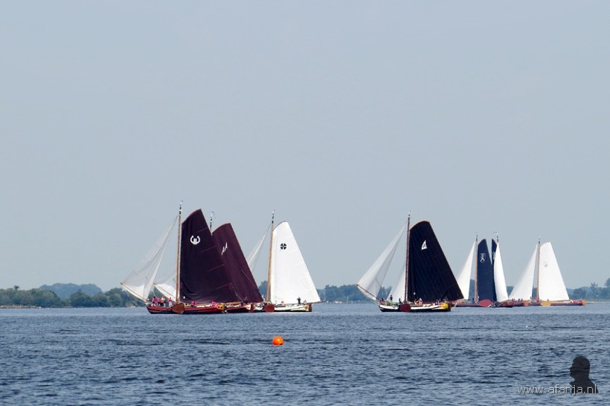 Hoewel het veld vrij ver bij ons vandaan lag, konden we vanaf ons plekje bij het gemaal m.b.v. verrekijker en zoomlens toch mooi zien hoe de boeien werden gerond door de skûtsjevloot …