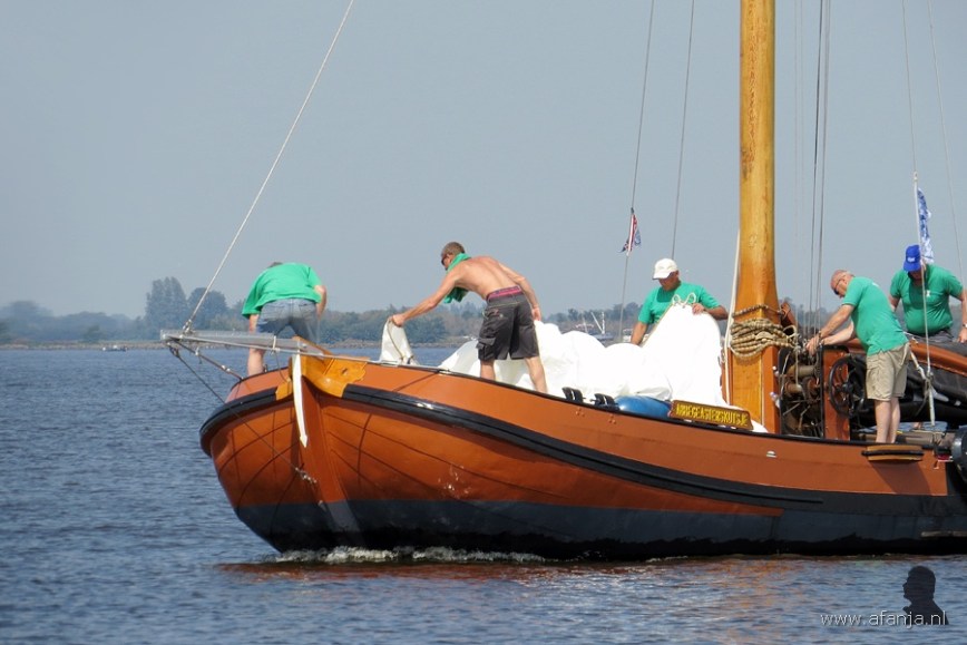 Het skûtsje ‘De Eemlander’ uit Eemnes kwam uiteindelijk als eerste over de finish, maar ook voor de supporters van het ‘Abbegeaster skûtsje’, die in groene t-shirts naast ons op de eerste rij zaten, werd het een prima dag. Na een matige start wisten ze uiteindelijk op te klimmen naar een keurige tweede plek …