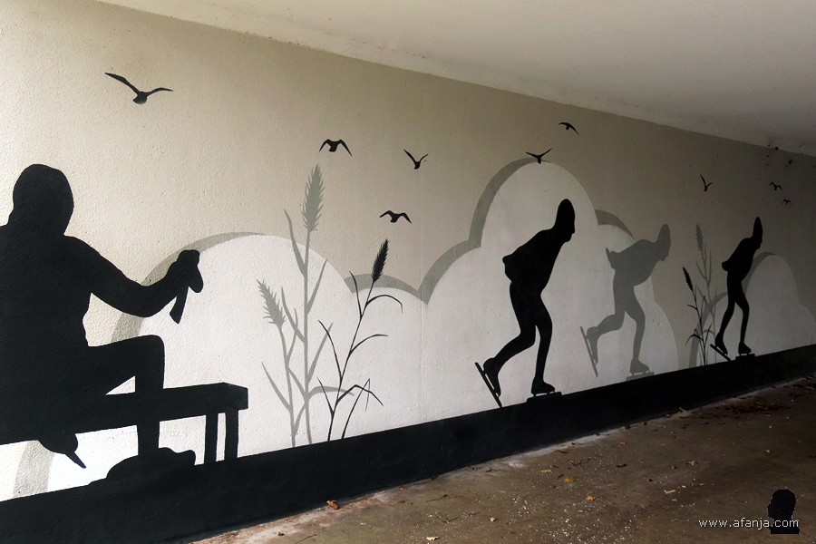 Het moet toch mogelijk zijn om daar wat moois van te maken, zodat wandelaars en fietsers er echt een mooie entree krijgen! Neem eens een voorbeeld aan deze prachtige fietstunnel vol schaatsers bij schaatsdorp St. Jansklooster in De Weerribben. Aangezien het fietspad voorbij KAPKAR / A7-29 X FT en de fiets tunnel zowel in oostelijke als in noordwestelijke richting naar sportcomplexen leidt, zie ik in dit tunneltje onder de A7 wel een mooi groen landschap waar diverse sporten aan fietser en wandelaar voorbij trekken …