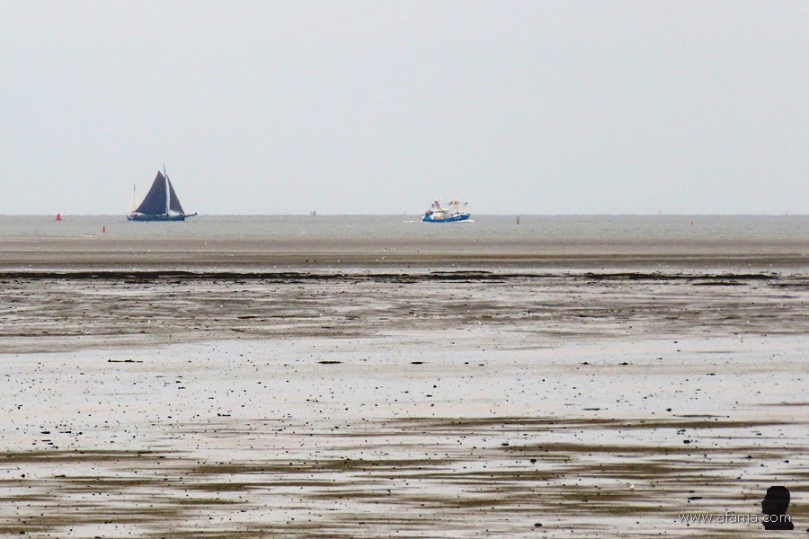 Daar kwamen we aan de voet van de dijk bij de Waddenzee terecht. In de verte zochten een vissersschip en een paar zeilboten hun weg door de goeddeels drooggevallen zee …