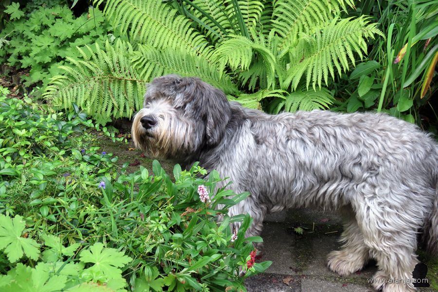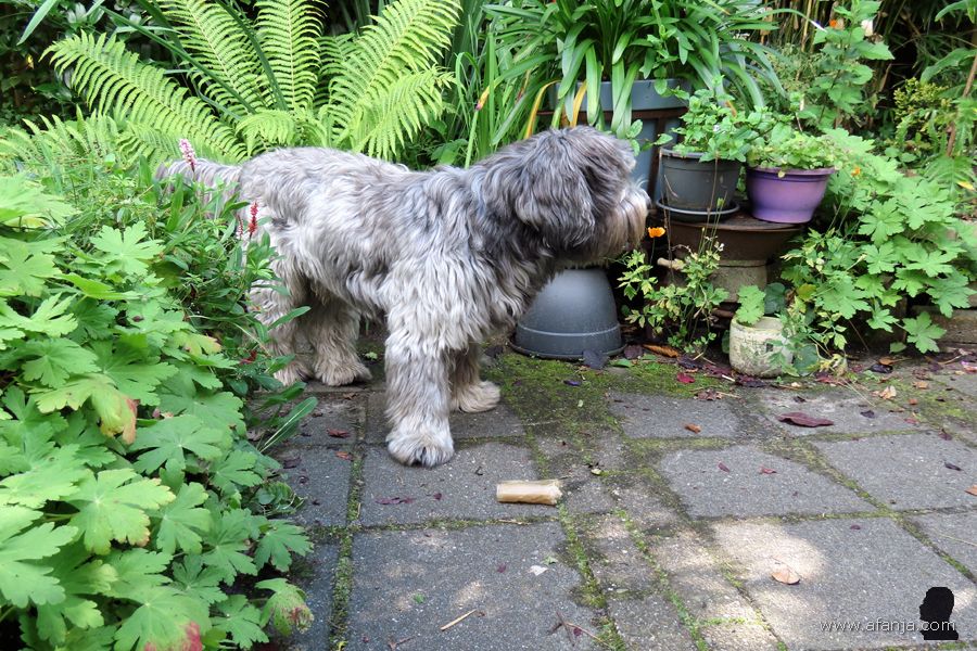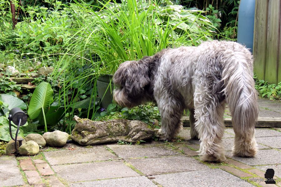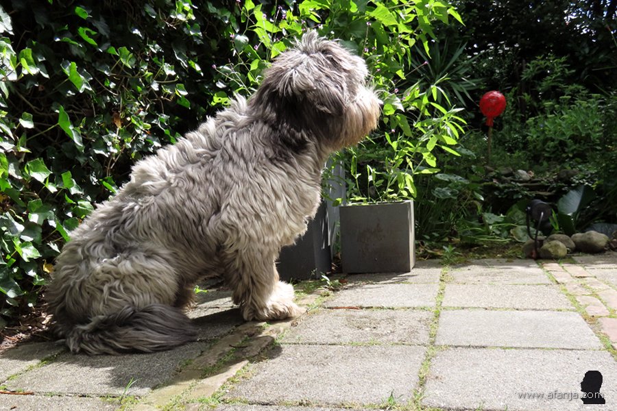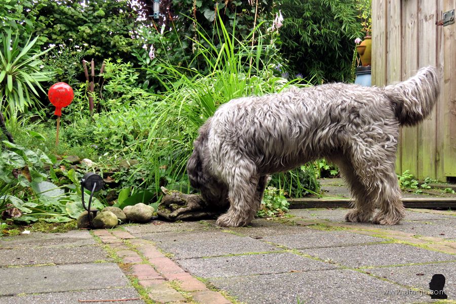 En dus werd Oskar hier twee weken geleden gedropt samen met een grote zak brokken en zijn water- en voerbak. De volgende dag ging hij op verkenning in de tuin, alles werd uitgebreid bekeken en besnuffeld. Bij de schuttingdeur aangekomen, besloot hij eerst maar eens een flinke vlag te planten. Nu wist de hond van de buren in ieder geval dat Oskar het hier voorlopig voor het zeggen had …