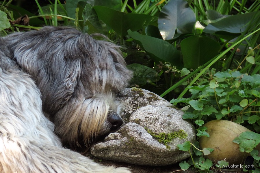 Zo’n dier vertelt er niet veel over natuurlijk, maar ik heb wel de indruk gekregen dat hij zich wel thuis voelde in de tuin. Er waren fijne zonnige plekjes om lekker te liggen, en als het te warm werd was er schaduw voor handen, had hij al snel ontdekt. Het duurde niet lang of hij was zelfs bevriend met onze terraspoes, ze hebben menigmaal lekker dicht tegen elkaar liggen slapen op het terras …
