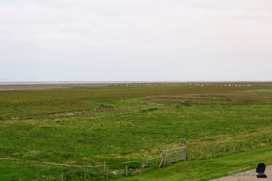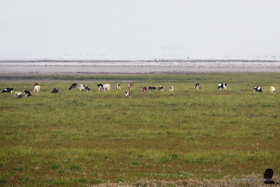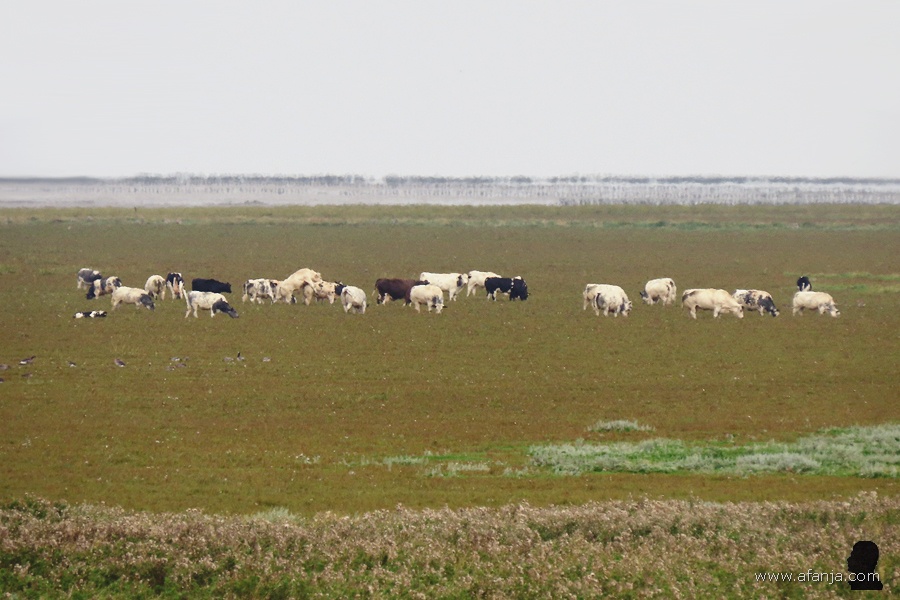 Een stuk dichterbij stond aan de voet van de dijk achter een dubbele omheining een kleine kudde runderen. Toen ik de dijk afdaalde, begon het vee samen te drommen bij de toegang van hun weiland …