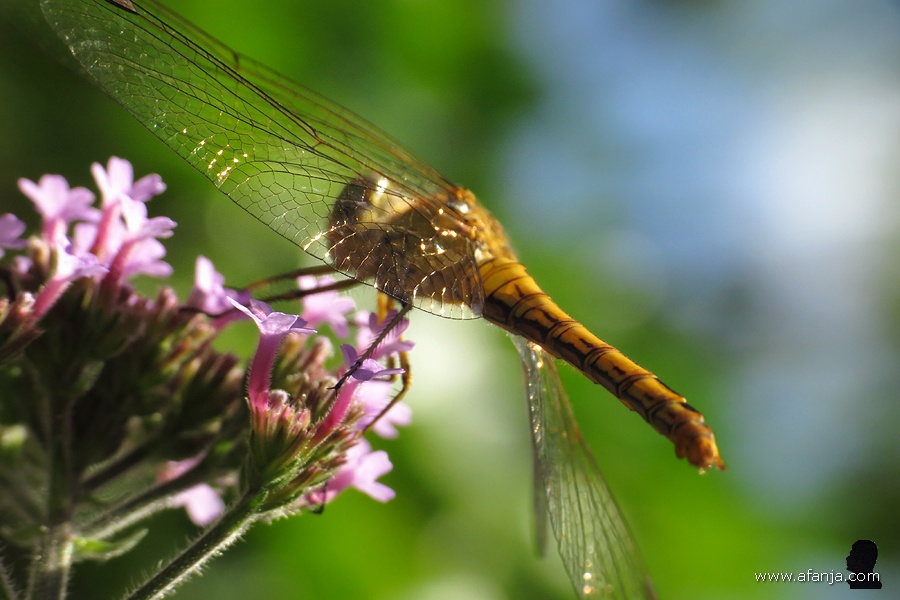Op de warmste uren van de dag zit ik het liefst in mijn relatief koele computerhoekje. Regelmatig draai ik mijn bureaustoel even naar rechts om een blik in de tuin te werpen. Meestal levert dat niet veel bijzonders op en kan ik me al snel weer op het beeldscherm richten. Sinds de ijzerhard (Verbena) op het terras weer in bloei staat, strijkt daar gelukkig weer vaak fotogeniek leven op neer …