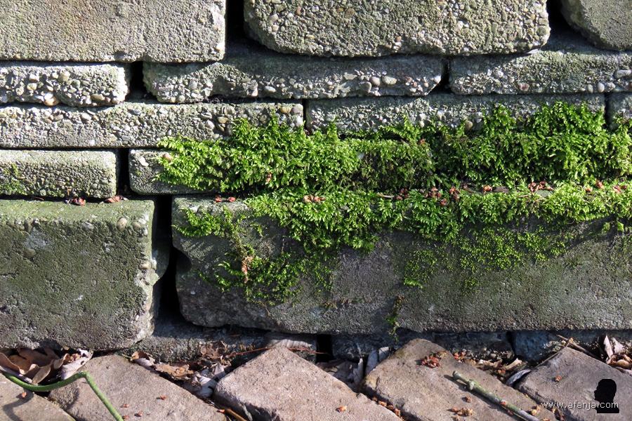 Maar goed, genoeg over de grond gekropen, verderop valt nog wel meer mos te zien. Voor nu is het tijd om weer op te krabbelen en nog even wat rond te kijken langs de onlangs opgetrokken muren …
