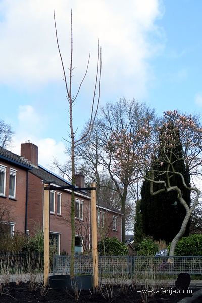 Half februari werden bijna alle bomen in onze straat in opdracht van de gemeente op professionele wijze geveld. Heel jammer, want behalve voor een mooi groen beeld, zorgden ze op warme dagen ook voor wat lokale verkoeling. Maar ja, er zat ziekte in en zachte heelmeesters maken stinkende wonden, daarom zijn ze gerooid. Maar ze zijn wel meteen keurig vervangen door nieuwe bomen, zodat we nu een jonge esdoorn voor de deur hebben …