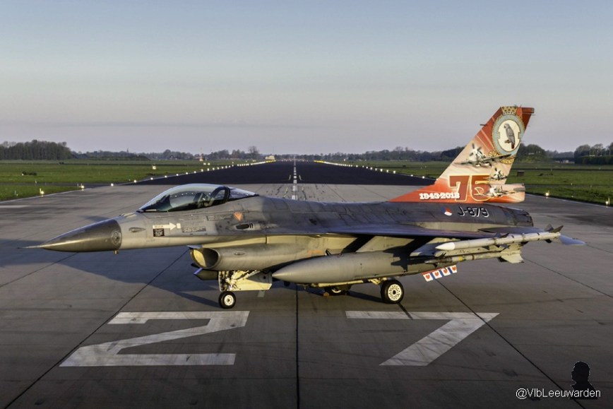 Ter gelegenheid van het 75-jarig jubileum vliegt de Leeuwarder F-16 met staartnummer J-879 dit jaar met een jubileum-staart. Op de foto’s hierboven is het toestel net opgestegen. Op de onderstaande foto staat hij in volle glorie te pronken met op de staart de mascotte van het 322 squadron: de grijze roodstaart papegaai Polly Grey V en onderaan het toestel de hartelijke groeten uit Fryslân …