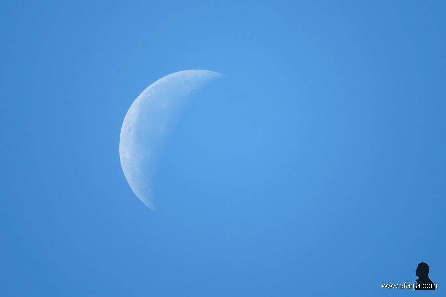 Ik zoek mijn onderwerpen niet alleen op de grond of in het water, ik kijk er ook graag voor omhoog. Hoger dan de vogels in de lucht, vind ik ook de maan vaak de moeite van het fotograferen waard. De volle maan fotografeer ik maar zelden, die is me wat ‘te vlak’. In andere fasen zijn de kraters op de maan vaak mooier te zien. De onderstaande foto heb ik 2 maart tegen vijf uur ’s middags gemaakt (klikken = vergroten) …