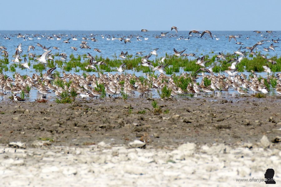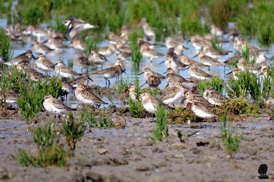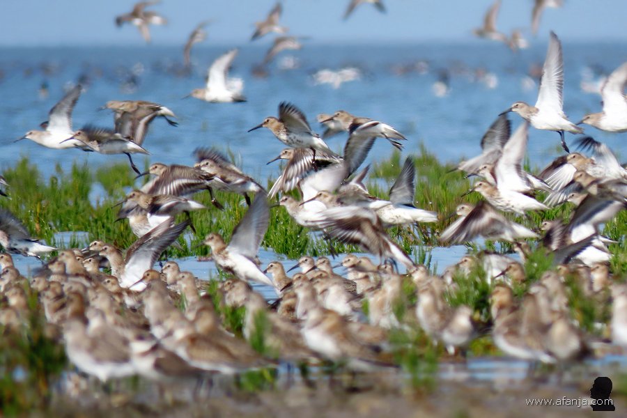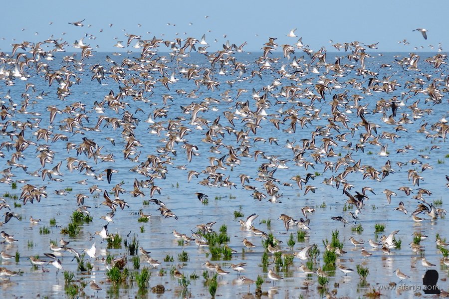 Ik had trouwens ook helemaal geen tijd om daar verder over te piekeren, het was nog steeds één en al actie boven het Wad. Fascinerend om die groepen vogels te zien en te horen. Een deel van de vogels – voornamelijk bonte strandlopers – landde aan de kant, waardoor ik ze beter in beeld kreeg. Morgen komt er een Wadvogel zelfs lekker close het beeld in wandelen …
