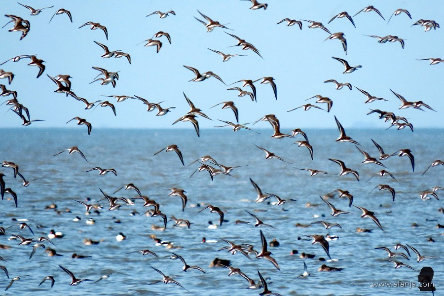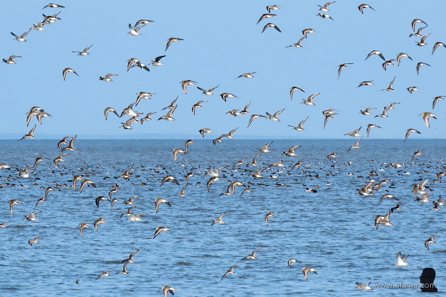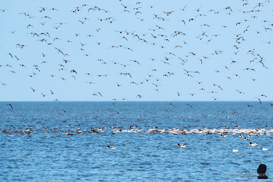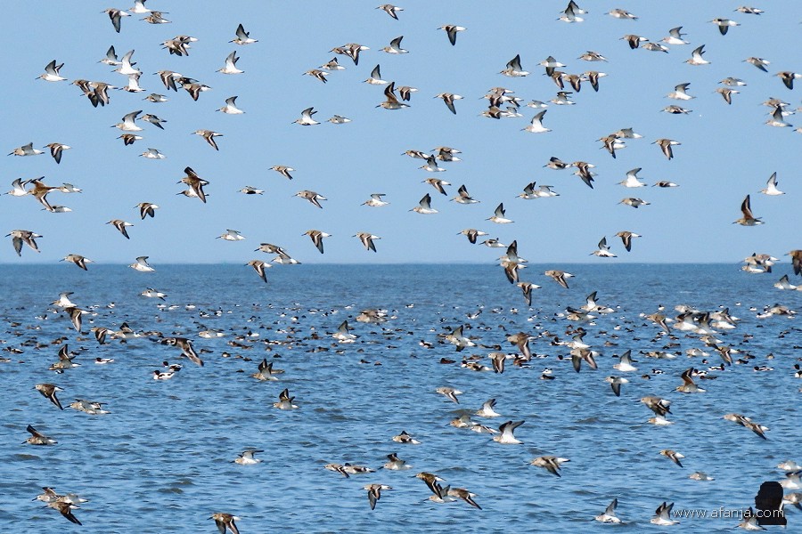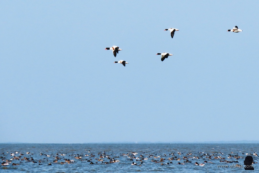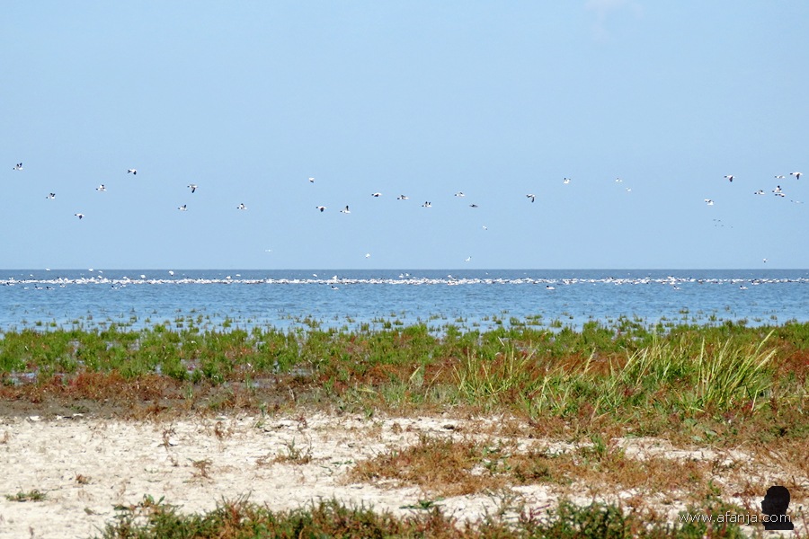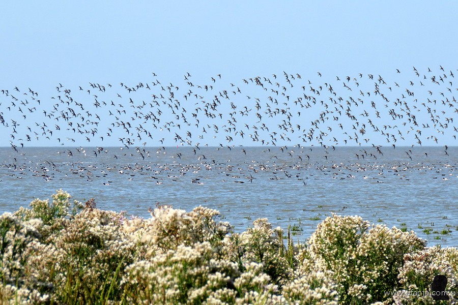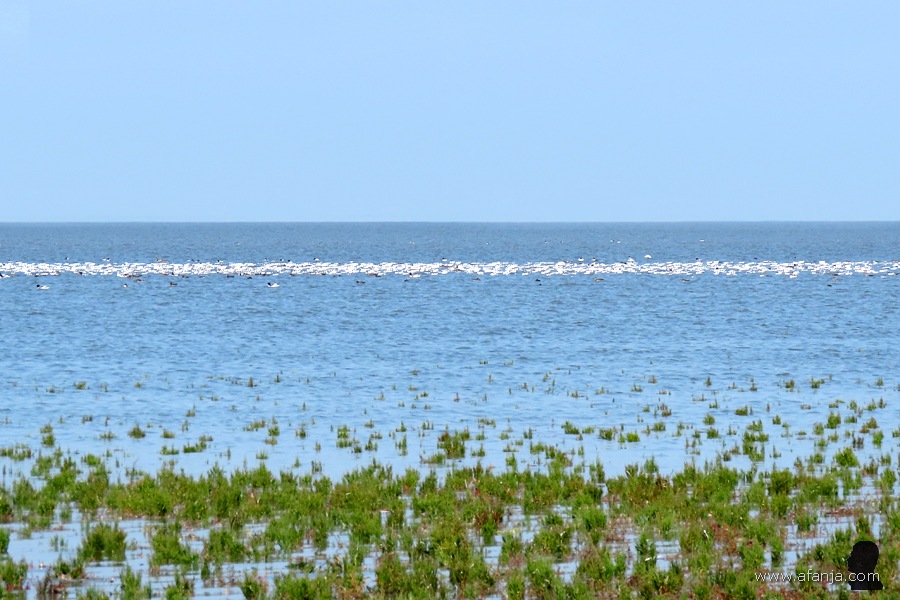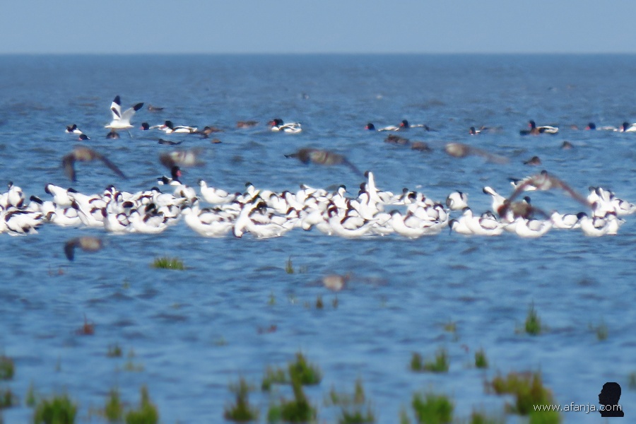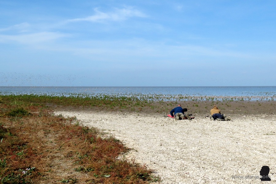 Wij troffen die dag laag water, dus we hadden honderden meters de kwelder op kunnen lopen zonder ook maar een vogel te verstoren. Pas toen ik tot het uiterste had ingezoomd, waren op de derde foto hieronder de vage schimmen van vogels te zien. De vogels zaten zo ver weg, dat we niet eens de kwelder op gegaan zijn. In plaats daarvan besloten we naar de laatste locatie van die dag te rijden …
