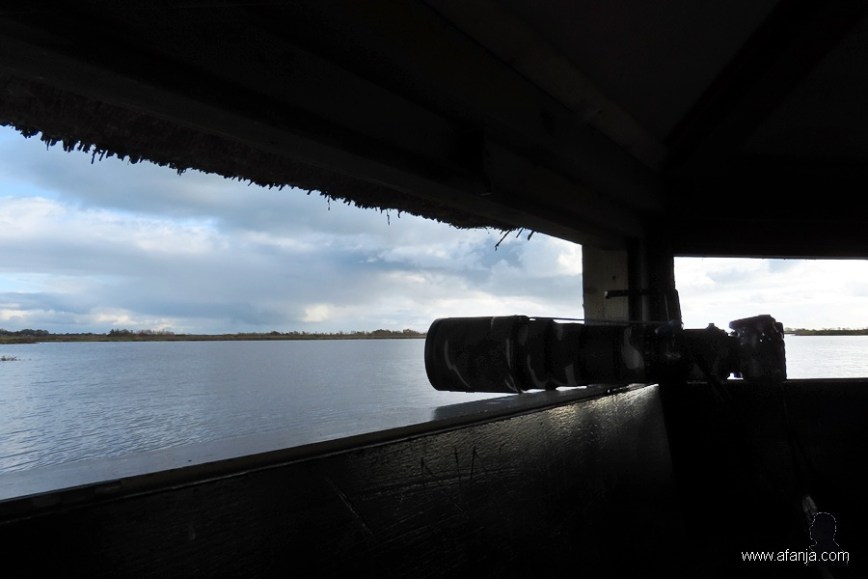Het zal trouwens met de oostenwind die over de watervlakte aan kwam waaien ook knap koud geweest zijn in de hut, denk ik. Daarom verkies ik mijn eigen mobiele kijkhut nu toch echt boven die andere hut. Als de huidige luchtdrukverdeling 1 of 2 maanden eerder op de weerkaarten was verschenen, dan hadden de liefhebbers hier waarschijnlijk intussen al kunnen schaatsen. De pijlers van de kluunbrug die hier in februari 2012 werd aangelegd, staan nog steeds klaar, zoals je op de foto hierboven kunt zien …