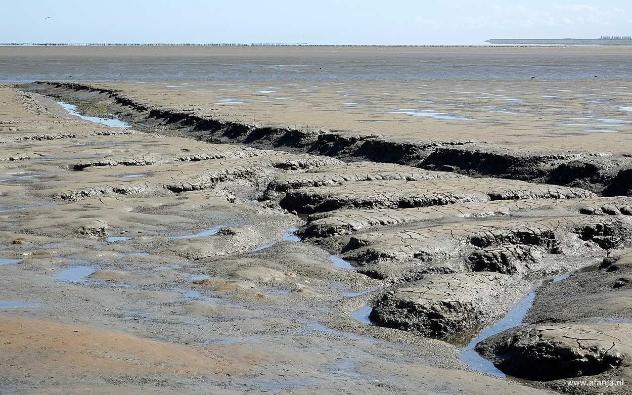 Je zou denken, dat het water bij eb heel geleidelijk over het oppervlak wegvloeit naar de Waddenzee. Naast de strekdam ligt echter een slenk, die mooi laat zien dat het water hier bij eb en vloed zijn eigen weg zoekt en dan toch flink wat kracht krijgt om het landschap te tekenen …
