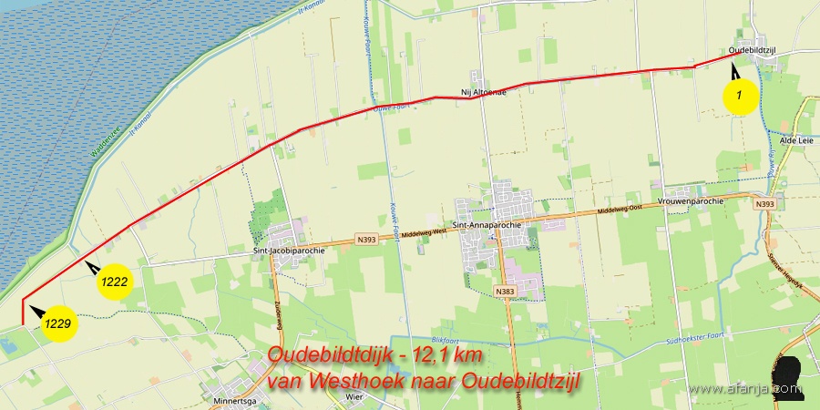 Aan de overkant van de Oudebildtdijk en de Ouwe Faart staat een prachtig huis met nr.1 van bouwjaar 1930. Daarmee hebben we de ruim 12 km lange Oudebildtdijk beginnend bij nr. 1229 en eindigend bij nummer 1 van eind tot begin gereden …