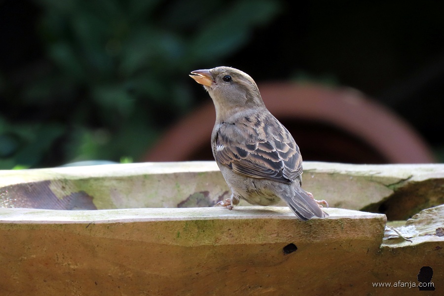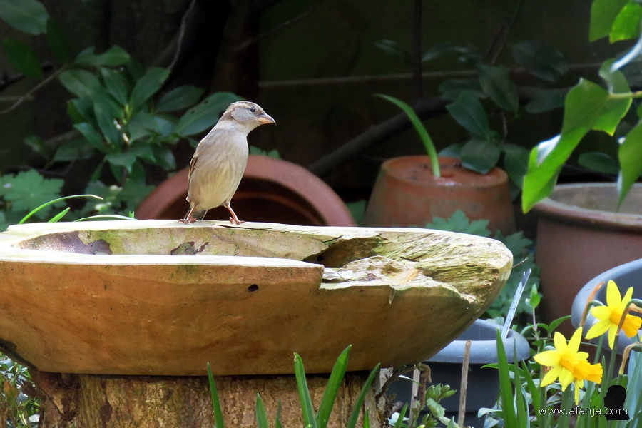 Ze kunnen echt zo gezellig met elkaar zitten kletsen in onze hazelaar en de hulstboom van de buurvrouw. Van daaruit duiken ze onze tuin vaak in, vooral de grote houten waterbak met de brede rand is populair …