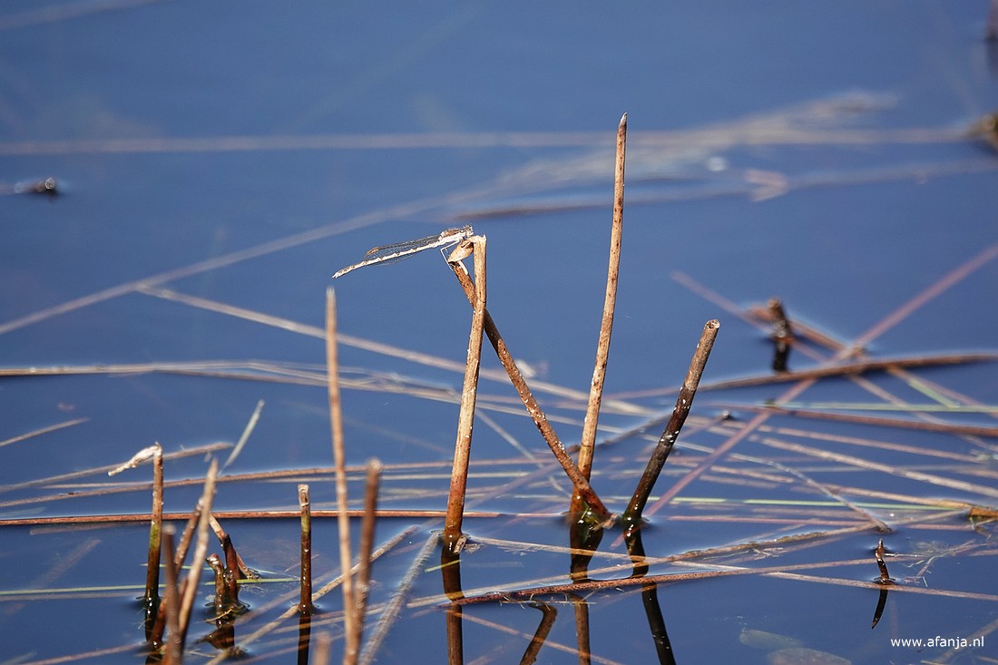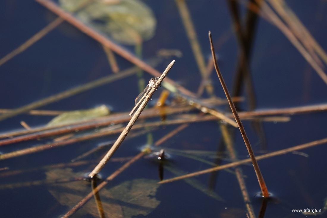 ‘Dan hebben we vanmorgen geluk gehad met de twee ringslangen die we hebben zien passeren,’ reageerde ik op mijn beurt. Daarna kregen we het over het enige andere levende wezen dat ik er ’s ochtends had gezien: een waterjuffer. ‘Dat binne brúne winterjuffers‘, vertelde een van mannen. Zij hadden ze zojuist ook uitgebreid geportretteerd. Toen een van de mannen me speurend naar de korte rietstengels in het water zag kijken, wees hij me op zo’n juffertje: ‘Sjoch, dêr sit der ien …’