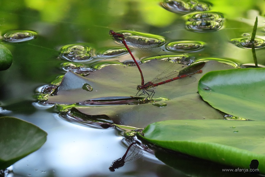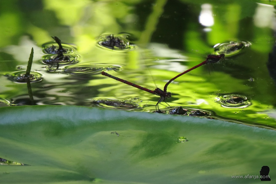 Wel heb ik een mooie fotoserie kunnen maken van de kikker in de vijver. Hij stond toe dat ik hem van alle kanten ongestoord kon bekijken en fotograferen. Zelfs voorover buigen om een wat lager camerastandpunt te krijgen, verontrustte hem niet. De kikker die achter de vijver zat, sprong wel met een beschaafd plonsje de vijver in, toen ik te dichtbij kwam …