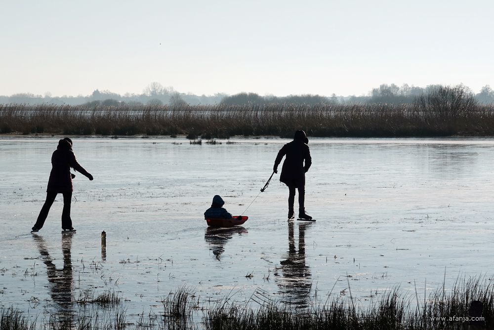 En zo was het ook. Op de eerste kleine ijsvlakte achter de windmotor aan de Wolwarren zag ik in tegenlicht vier schimmen op het ijs. Twee jonge vrouwen met een kind op een slee en een manspersoon die de slag alweer aardig te pakken had. Op de walkant zaten nog twee mensen die bezig waren hun schaatsen onder te binden …