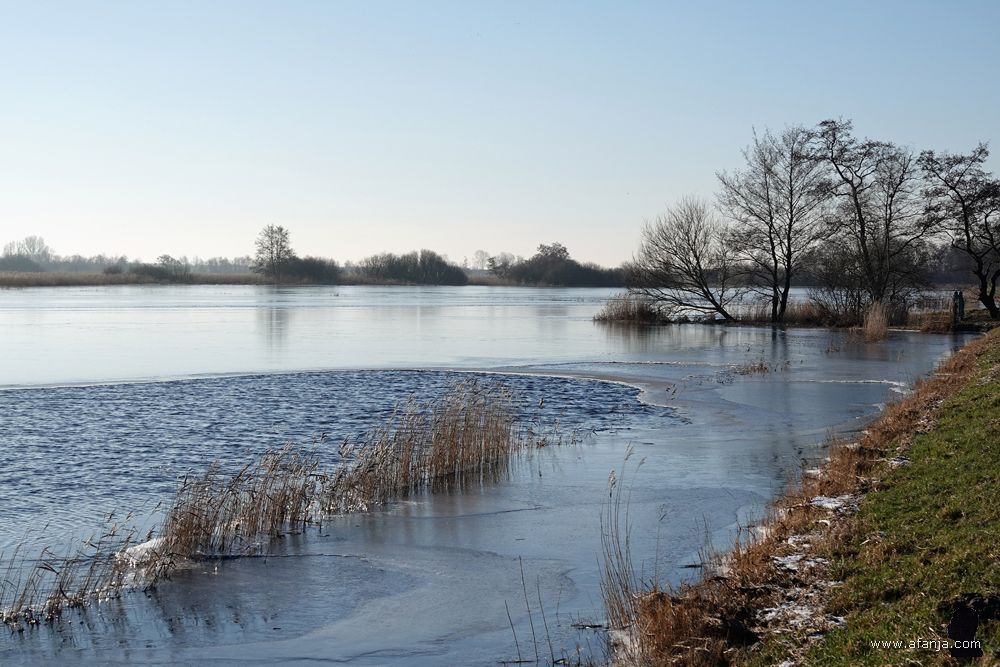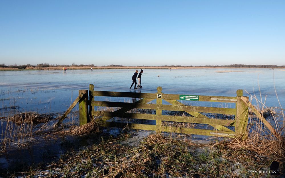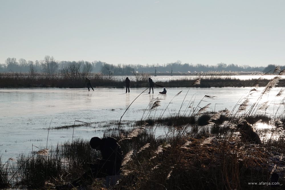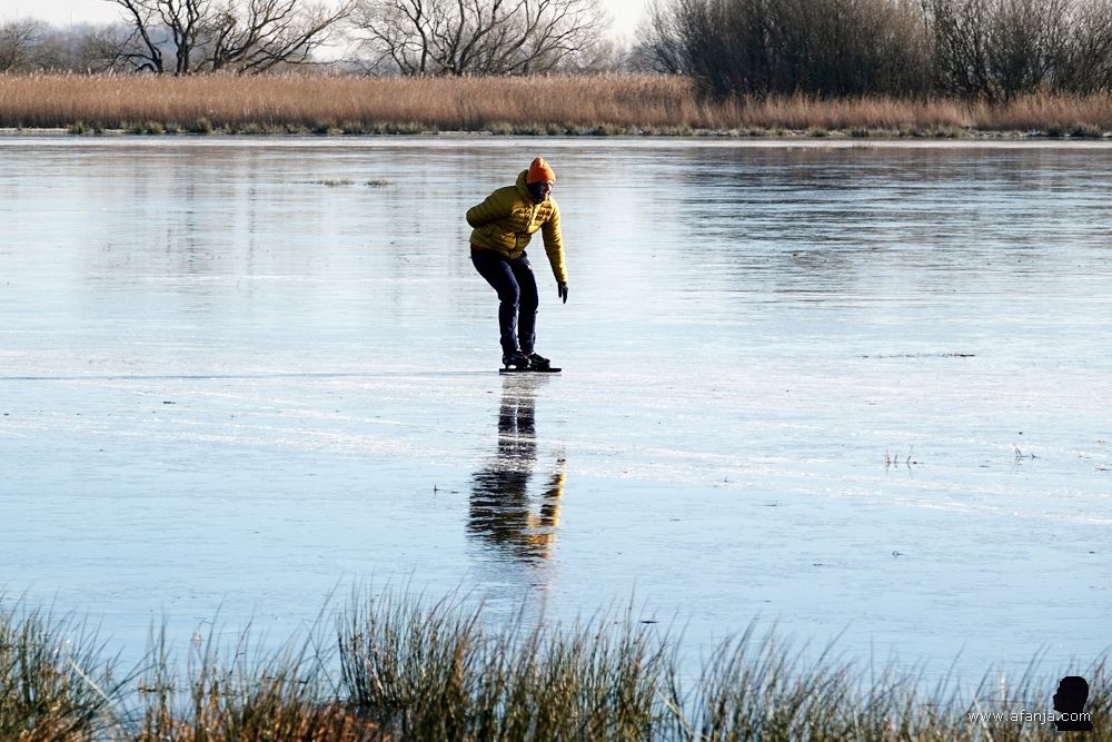 Vorig jaar kon ik op 10 januari de eerste schaatsers op deze kleine ijsvlakte fotograferen (foto hieronder). Het was de eerste van in totaal 3 dagen, waarop er op verschillende stukken ondergelopen land in de omgeving geschaatst kon worden. Het bleef anderhalve week licht winters weer, waarin ik ruim 1000 foto’s met sneeuw- en ijspret heb kunnen maken …