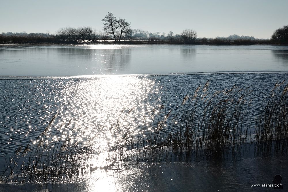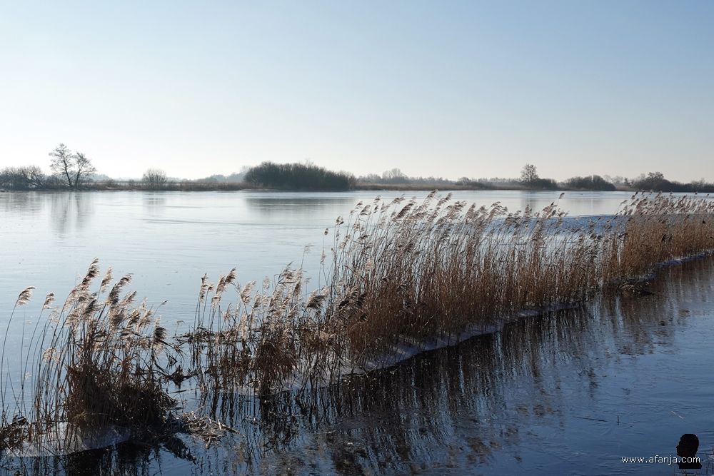 Dit jaar zou de oogst wel eens beperkt kunnen blijven tot een tiental foto’s, waarop niet meer te zien is dan een dun laagje ijs omgeven door rietkraagjes. De rietkraagjes zijn wel mooi uitgelicht door de zon, die op dat moment al omfloerst werd door hoge bewolking. Winter lijkt voorlopig ver weg …