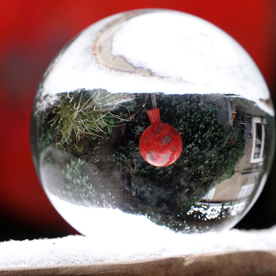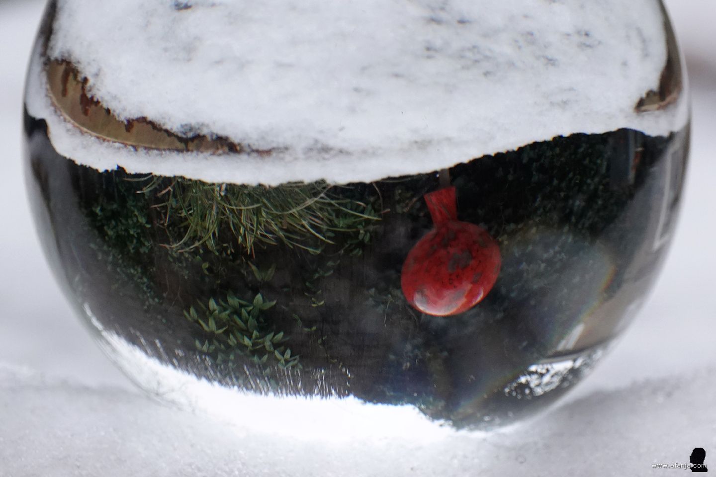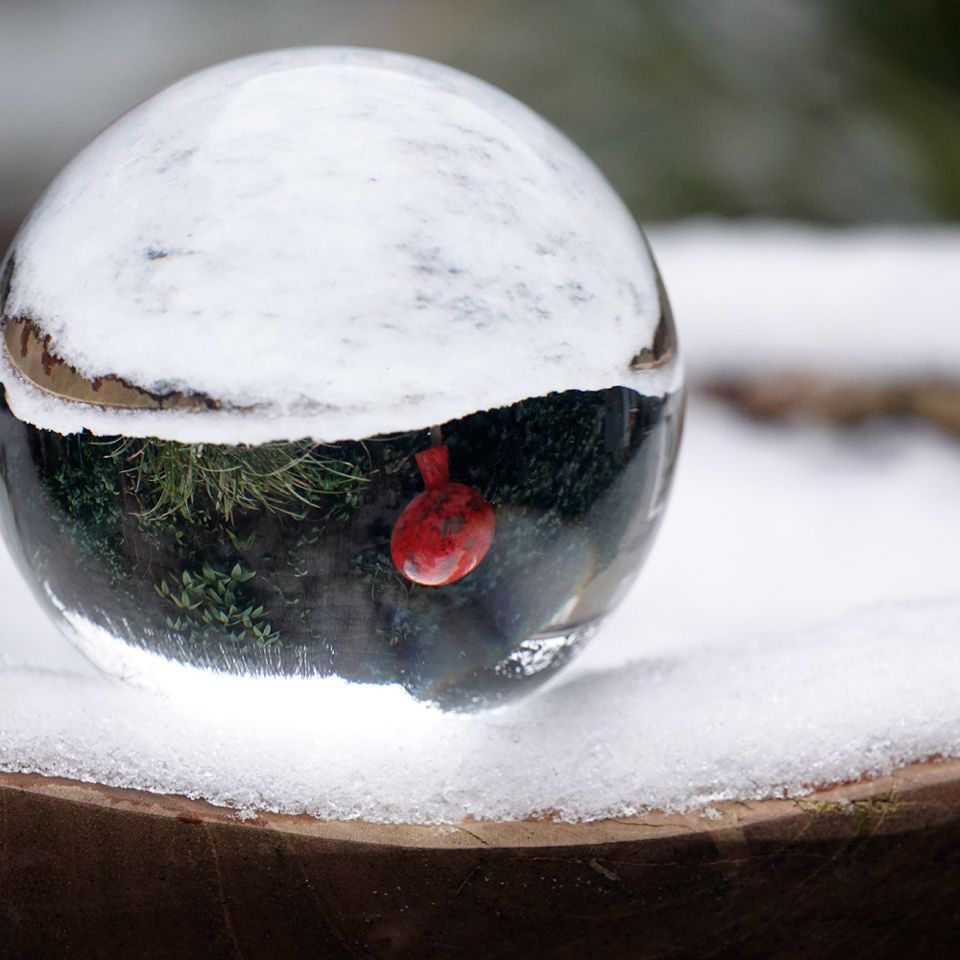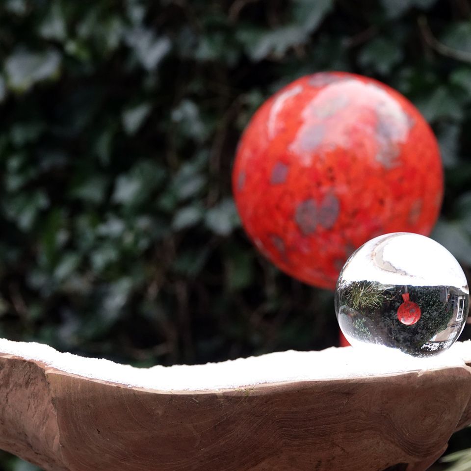 Ergens rond half januari heb ik mijn glazen bol – een zogenaamde lensbal – maar eens meegenomen naar de sneeuw de tuin …