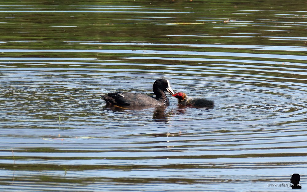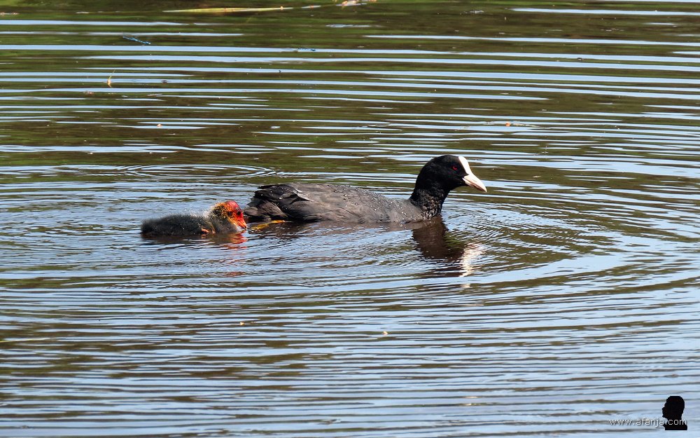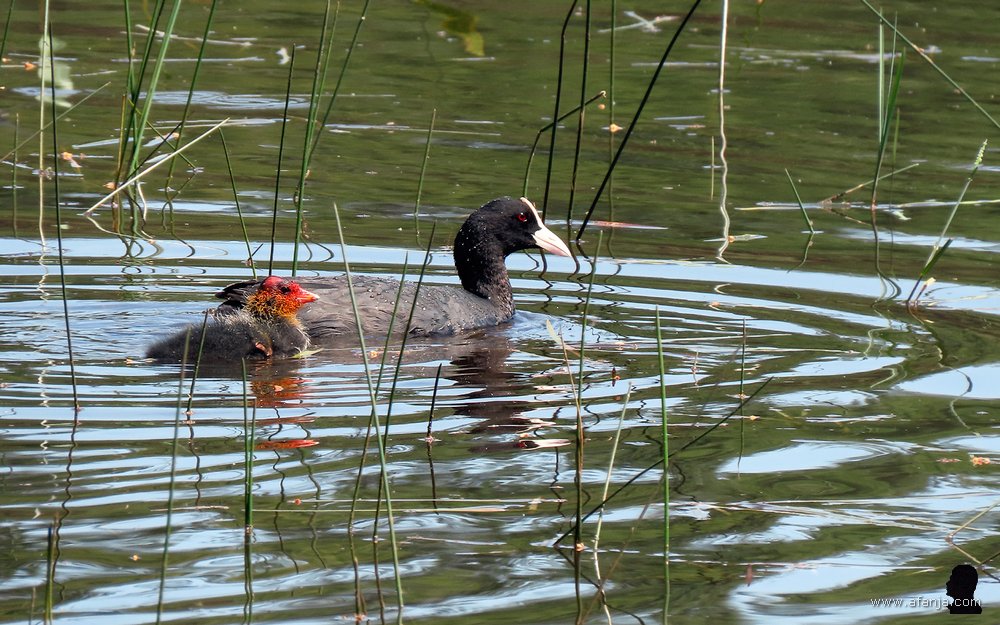 Na een minuut of wat zag ik wat bewegen in of op het water. Op het moment dat ik me teruggetrokken had op het bankje waren er een paar meerkoeten met een jong tevoorschijn gekomen op het Witte Meer. Stapje voor stapje liep ik naar de waterkant om er een paar foto’s van te maken. Het was ook Jetske niet ontgaan, zij kwam voorzichtig over het vlonderpad dichterbij. Hoe behoedzaam we ook waren, onze aanwezigheid werd al snel opgemerkt, waarna de ouders hun jong tussen het beschermende groen loodsten waar ze al snel aan het oog van de fotografen waren onttrokken …