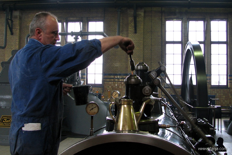 Gisteravond herinnerde ik me ineens dat ik in 2006 niet alleen een uitgebreide fotoserie van het gemaal heb gemaakt, maar ook een 3:27 min. durend filmpje onder de titel “Woudagemaal – Stoomkathedraal”. Het voordeel van video is, dat je er beweging en geluid bij hebt, en dat is zeker bij dit prachtige stoomgemaal een grote meerwaarde. Je ziet de zuigerstangen heen en weer dansen, je hoort het sissen en tikken van die machtige machines, en je ziet hoe de mannen van Wetterskip Fryslân voortdurend met oliekannen, -spuiten en -kwasten in de weer zijn om alles soepel te laten draaien …