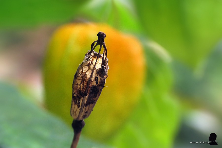 Het was een dode sprinkhaan, die daar mooi aan een zaaddoosje hing. Nu is het alleen nog de vraag of het stoffelijk overschot wordt weggewerkt door een spin of dat het ten prooi valt aan schimmels. Daarmee vergeleken sta ik er nog goed voor … 😅