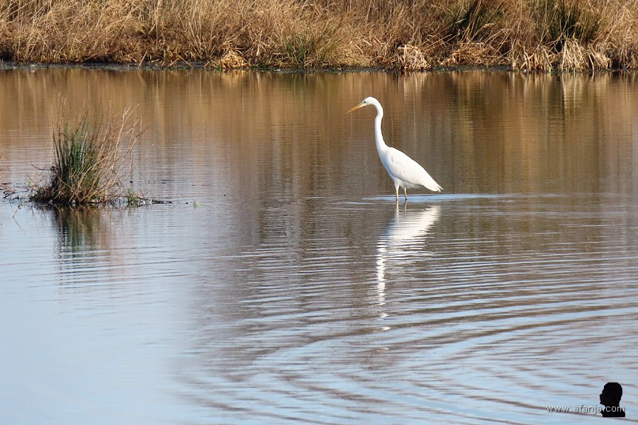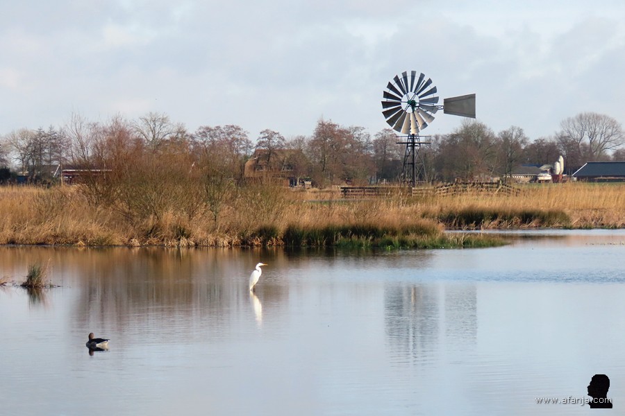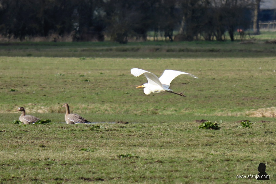 Dat betekende nog niet dat de ganzen nu het rijk voor zich hadden, want vrijwel meteen werd de blauwe reiger afgelost door een grote zilverreiger. Dat heb ik verder niet afgewacht, het werd nu toch echt tijd voor dat kuiertje …