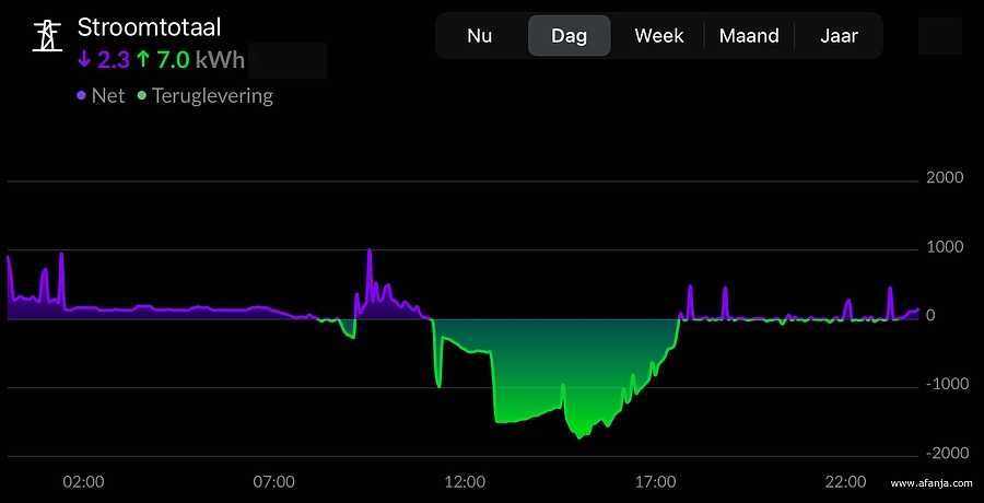 Hieronder zie je het stroomtotaal van dinsdag 18 maart. Paars is netstroom, groen is zonnestroom …