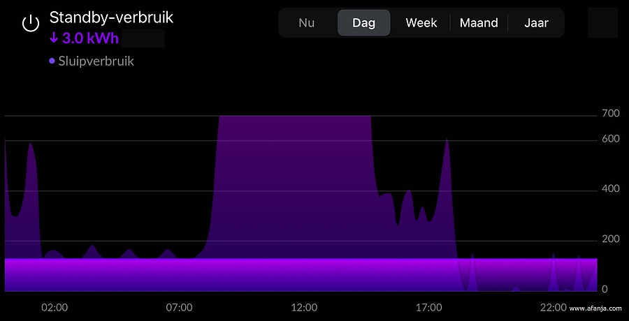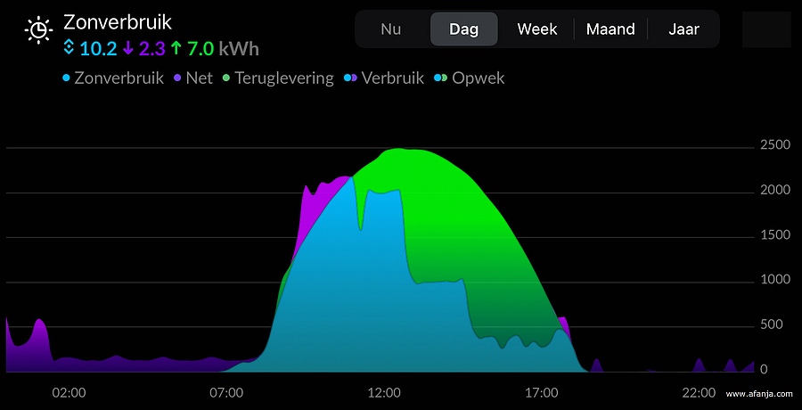 Als de zon ’s avonds van het dak verdwenen is, kunnen wij op dit moment de rest van de avond gebruik maken van de overdag opgewekte zonnestroom. Dat zal naar mate de nachten korter worden verder opschuiven, zodat we dan ook alle standby-verbruik kunnen opvangen met de batterij …