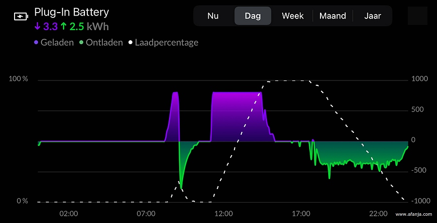 En hieronder staat dan het beeld van de plug-in batterij. Niet gebruikte zonne-energie wordt overdag in de batterij geladen. Zodra er te weinig directe zonnestroom beschikbaar is, wordt energie uit de batterij gehaald voor gebruik. Dat zie je o.a. hieronder in de ochtend, omdat we op dat moment een tijdlang de elektrische verwarming aan hadden staan.