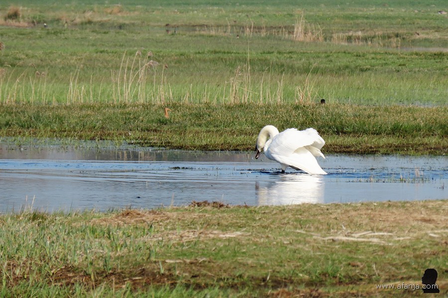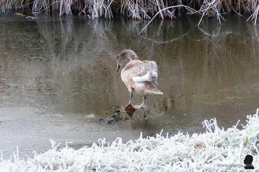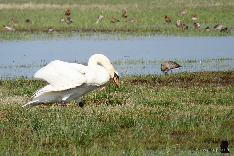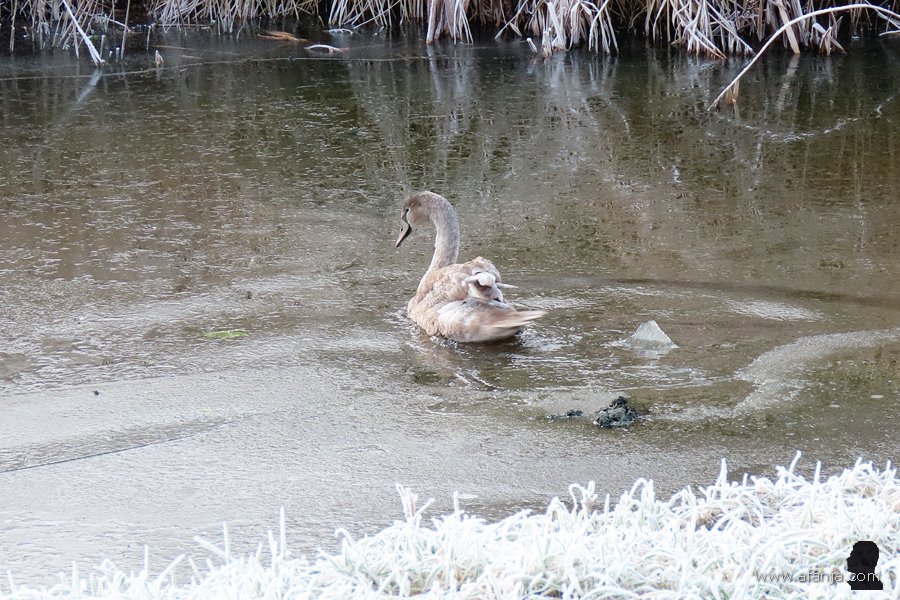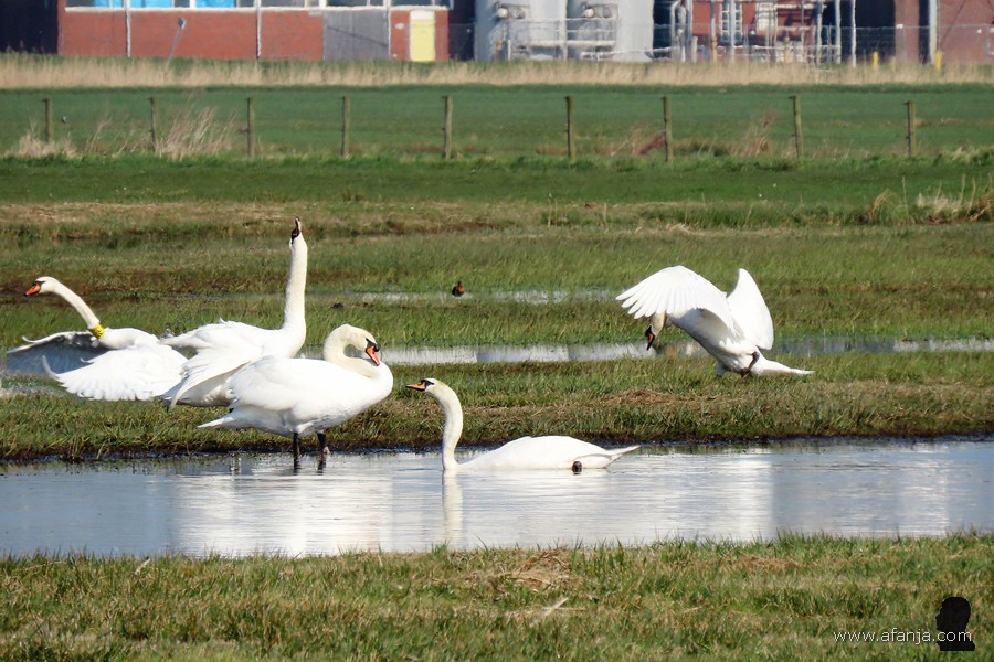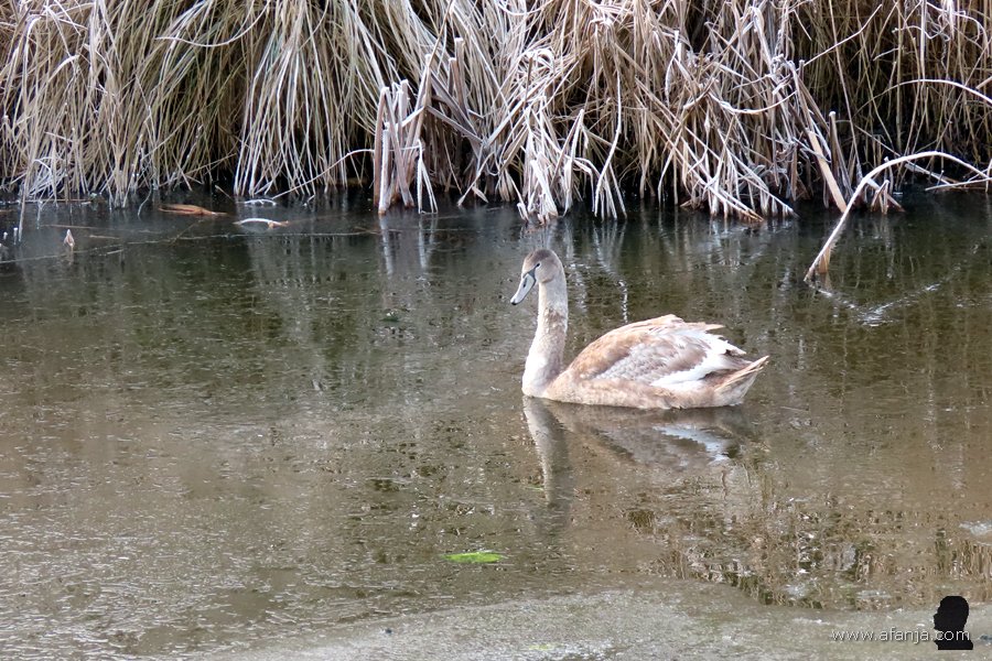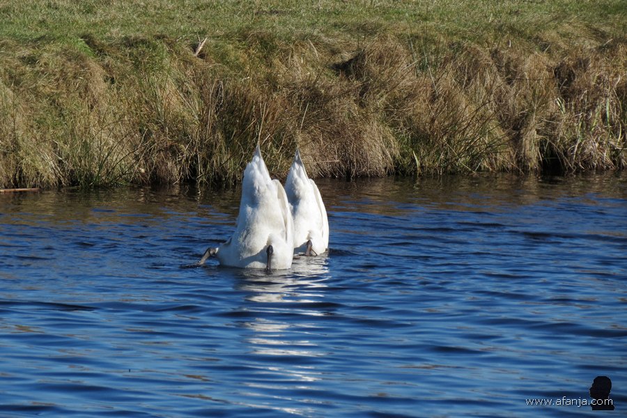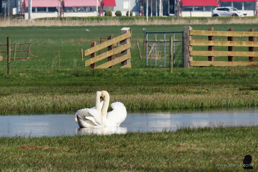 Terwijl we onze laatste sinaasappelsap bijna op hadden, zagen we iets verderop een paar knobbelzwanen met een opvallend spierwit jong op het water dobberen. Normaal gesproken zijn jonge knobbelzwanen grijs of grijsbruin. Omdat deze echt spierwit was, is fotomaatje Jetske maar eens op zoek gegaan op internet. Daarbij ontdekte ze, dat er in Polen lang geleden knobbelzwanen gefokt werden met een kleurverdunning, want het witte dons van de jonge Poolse knobbelzwanen was zeer populair. Totdat de markt voor dons volledig instortte …