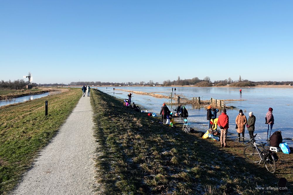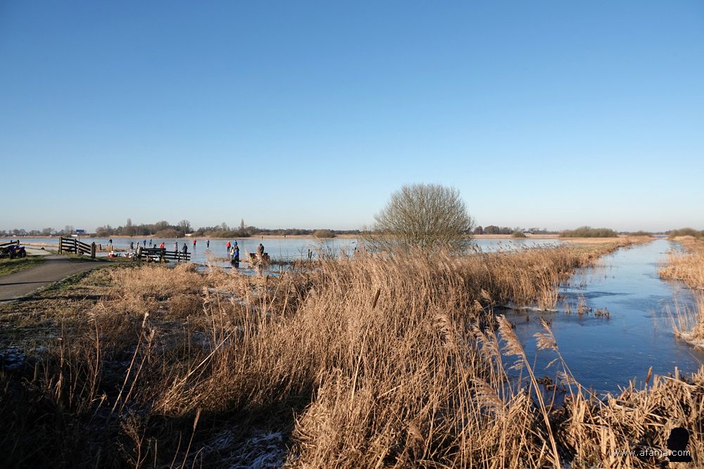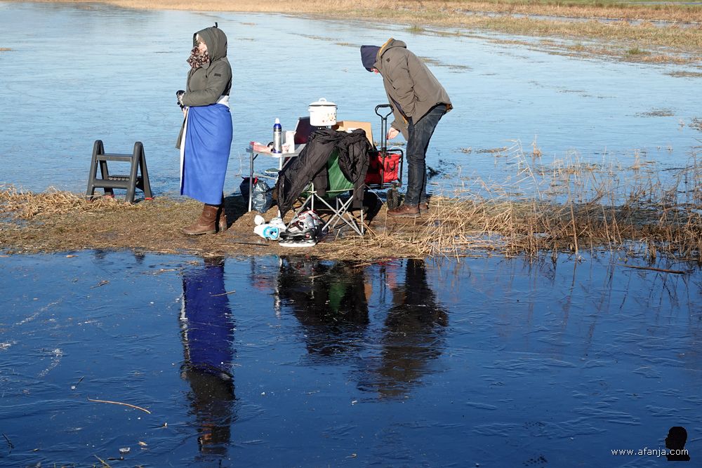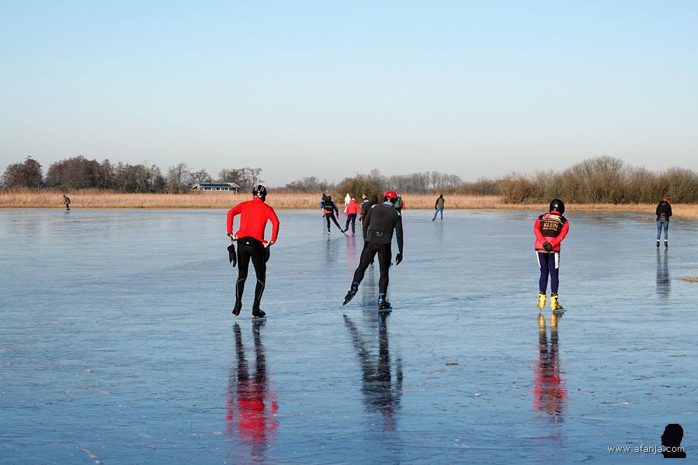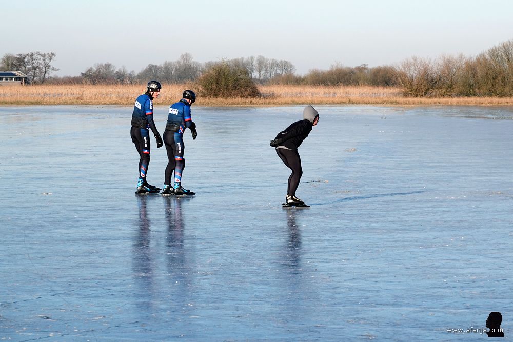 Ik had mijn blik net weer op de zwanen gericht, toen een deel van de grote vogels het luchtruim koos. Om ze te kunnen volgen, moest ik even naar een kijkopening aan de andere kant van de hut. Ze waren net los van het water, toen ik ze weer op kon pikken. Korte tijd later zag ik ze verdwijnen boven de bebouwing van Wommels. Het zwiepende geluid bleef nog lang klinken, omdat ze in een ruime boog achter de hut langs vlogen …